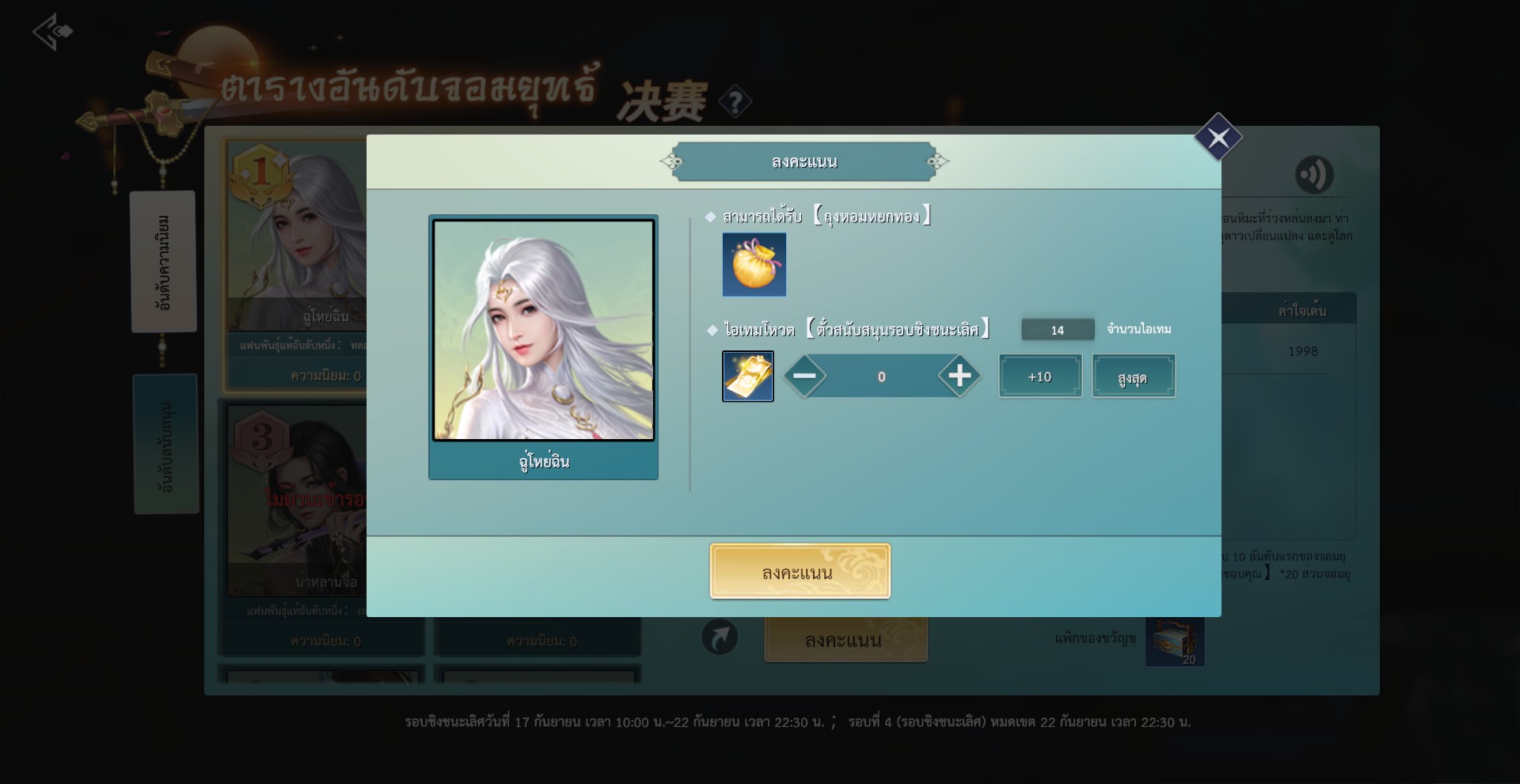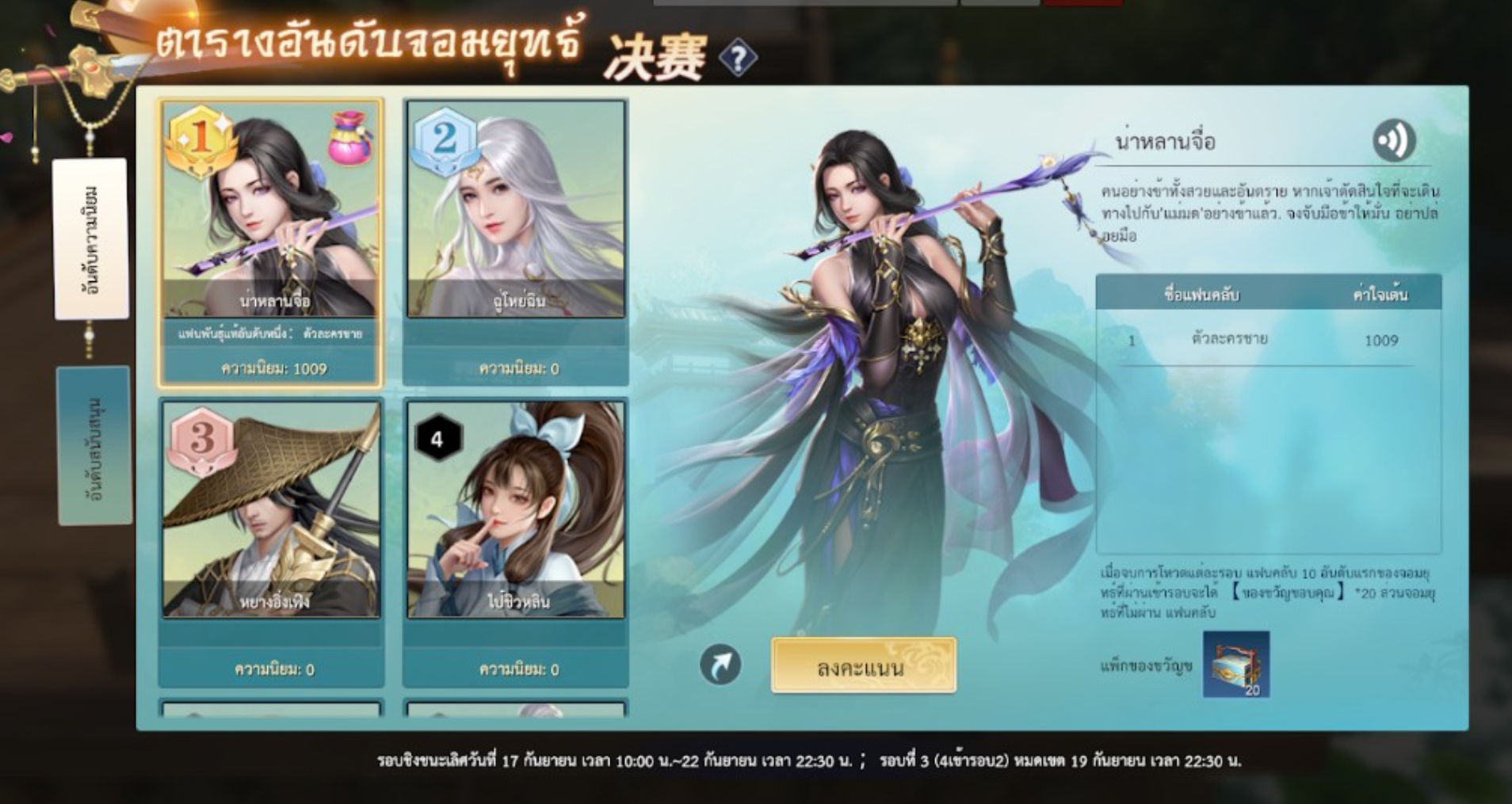 การประลองของยอดฝีมือในยุทธจักรได้เปิดม่านขึ้นแล้ว! เหล่าจอมยุทธ์ทั้งหลายเตรียมก้าวเข้าสู่เวทีแห่งเกียรติยศ ผู้ที่ได้รับการสนับสนุนสูงสุดจะได้ครองตำแหน่ง “อันดับจอมยุทธ์” พร้อมรับรางวัลล้ำค่า และเกียรติยศที่คู่ควร!