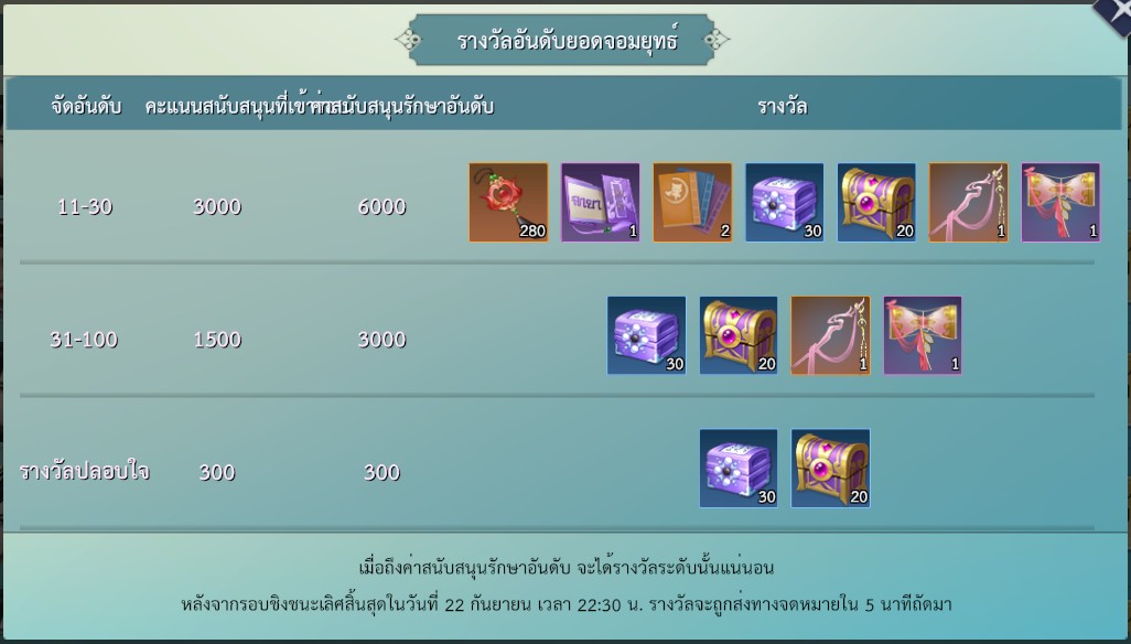 📌 แจกของรางวัล : 16 กันยายน เวลา 22:35 น. - รอบชิงชนะเลิศ : 17 กันยายน – 22 กันยายน 22:30 น.