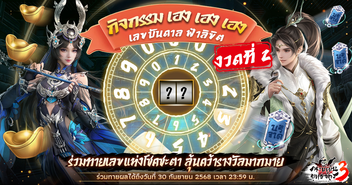 ถึงเวลาเหล่าจอมยุทธ์มาทดสอบดวงชะตา เข้าร่วมทายหว… อะแฮ่ม ทายเลขว่าเลขใดคือเลขนำโชคที่สวรรค์ชั้นฟ้าบันดาลมาให้กับท่าน หากท่านทายถูกก็รับรางวัลใหญ่ไปได้เลย! แต่ถ้าทายผิด… ไม่ต้องเสียใจไป เรามีรางวัลปลอบใจให้ทุกท่านที่เข้าร่วมกิจกรรม ✨