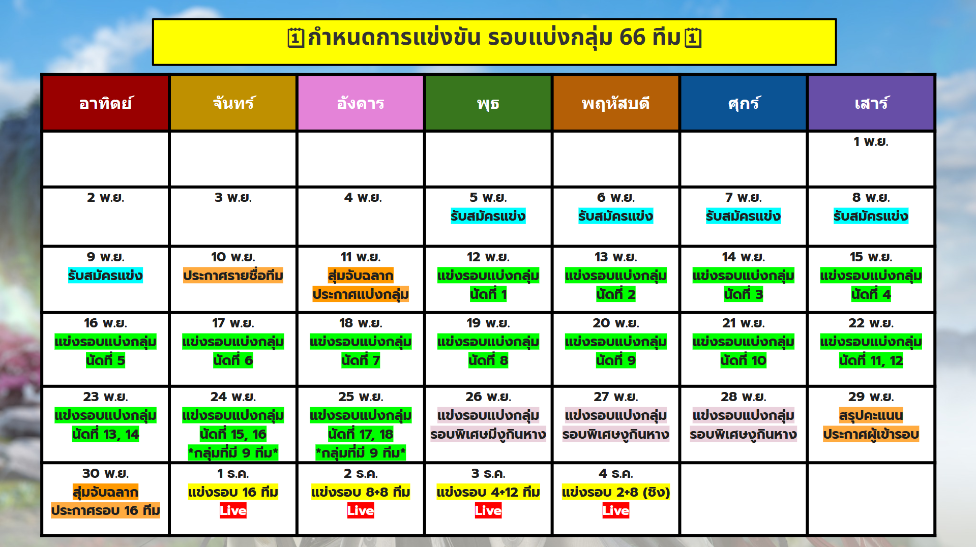 📢วันแข่งขันรอบแบ่งกลุ่มนัดพิเศษ วันที่ 27 พ.ย. 68 เวลา 18:00 น. – 21:00 น. (ถ้ามี)