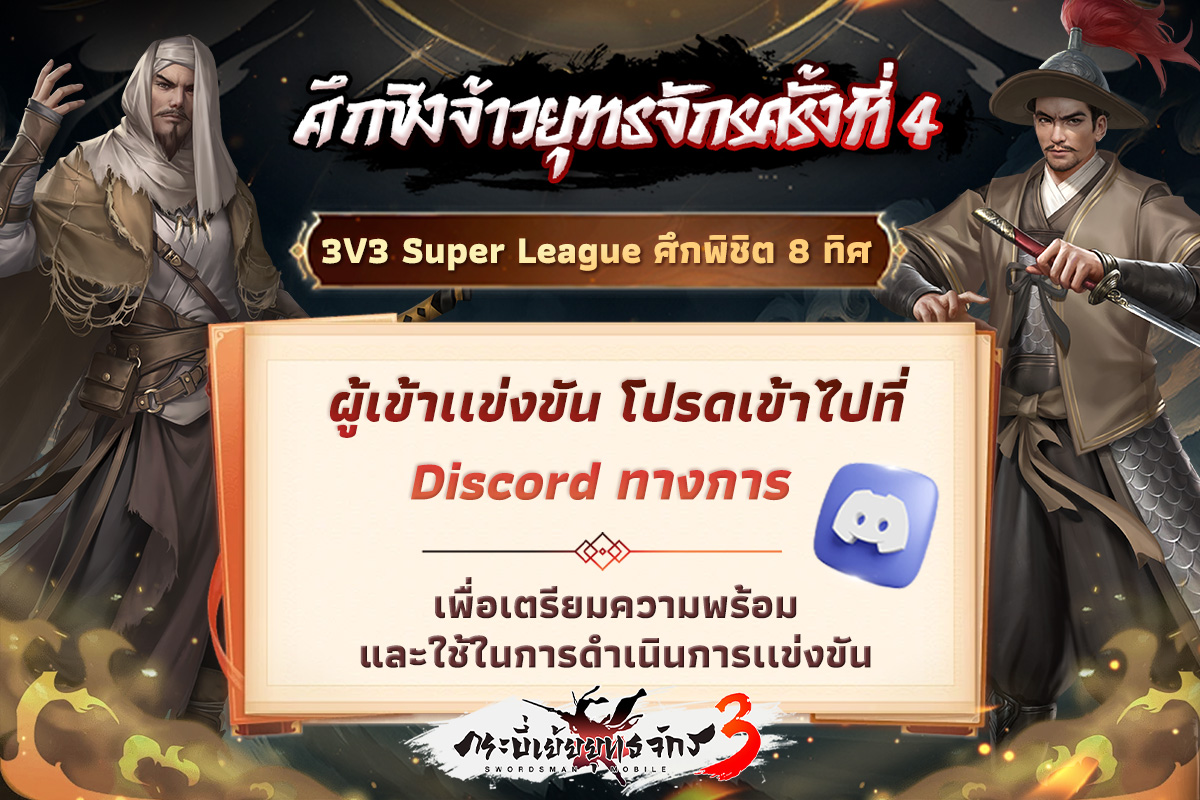 ✍️ ท่านสามารถตรวจสอบกำหนดการแข่งขัน แต่ละนัดๆ ว่ากลุ่มนี้กลุ่มนั้น ทีมไหนเจอกับทีมอะไร และรายละเอียดการแข่งขันได้ที่ Discord ทางการของเกม ในห้อง [⚔️ ศึกชิงจ้าวยุทธจักรครั้งที่ 4 ⚔️ 3v3 Super League ศึกพิชิต 8 ทิศ🔥] ตามหมวดหมู่ ประจำกลุ่มของท่าน