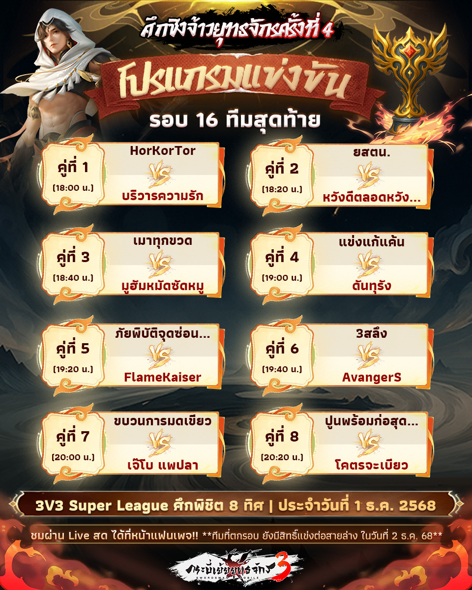 📢ศึกชิงจ้าวยุทธภพครั้งที่ 4 ในชื่อ 3v3 Super League ศึกพิชิต 8 ทิศ มาถึงรอบ 16 ทีมสุดท้ายแล้ว!! แต่ละทีมจะออกวิทยายุทธ์ สู้แบบใด โปรดติดตามกันได้ ณ บัดนี้!!📢