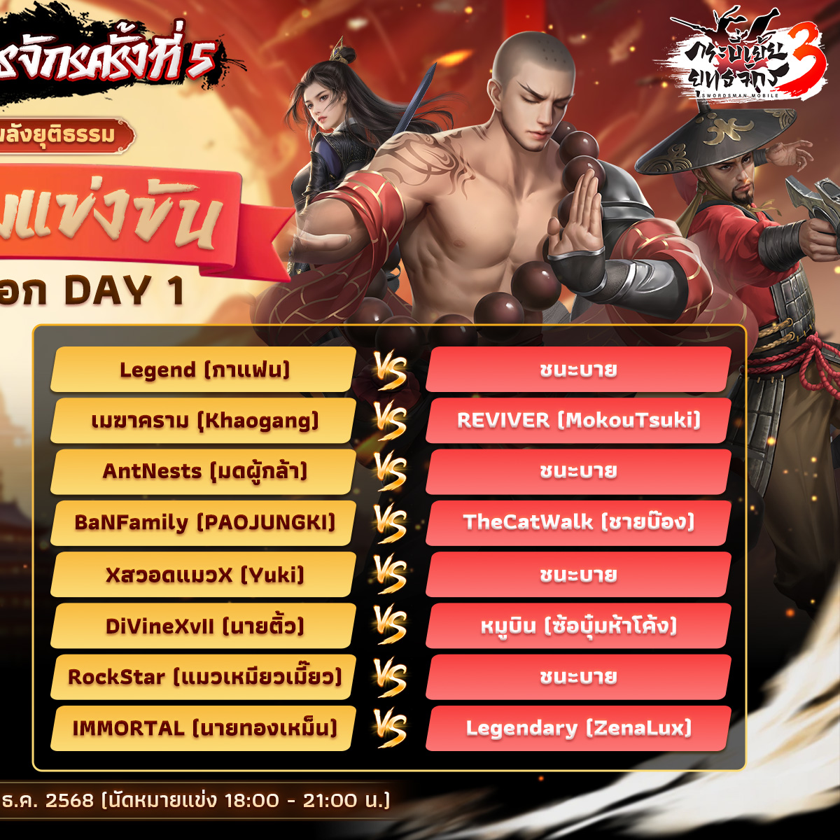 📢ศึกชิงจ้าวยุทธภพครั้งที่ 5 ในชื่อ 4v4 ศึกเย้ยยุทธจักรยอดพรรคครองพิภพ (โหมดพลังยุติธรรม) วันนี้เริ่มต้นแข่งขันกันแล้วในรอบคัดเลือก Day 1 ในรูปแบบ Double Elimination (แพ้ตกรอบได้ 1 ครั้ง) ที่ผู้เล่นจะต้องนัดหมายแข่งขันกันเองใน Bo3 ฉาก วิมานหยกและตำหนักศักดิ์สิทธิ์ กติกาเดิม ห้ามใช้สำนักซ้ำกัน นัดหมายแข่งตามเวลา 18:00 น. – 21:00 น. (หรือแล้วแต่จะตกลงกัน) จะดุเดือด กันขนาดไหน มาติดตามตารางกันได้ที่นี่!!