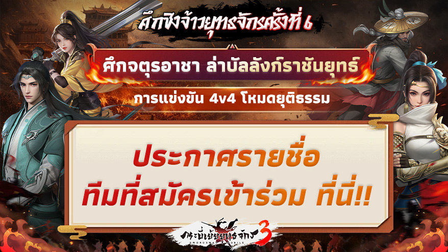 📢ประกาศรายชื่อทีมผู้เข้าแข่งขัน! ศึกชิงจ้าวยุทธจักรครั้งที่ 6📢 เหล่าจอมยุทธ์ทั้งหลาย! การแข่งขันโหมดอิสระ 4v4 พลังยุติธรรม ในชื่อศึกจตุรอาชา ล่าบัลลังก์ราชันยุทธ์ กำลังจะเริ่มต้นขึ้นแล้ว! (เริ่มแข่งขันตั้งแต่ 14-16 ม.ค. 2569 เป็นต้นไป)