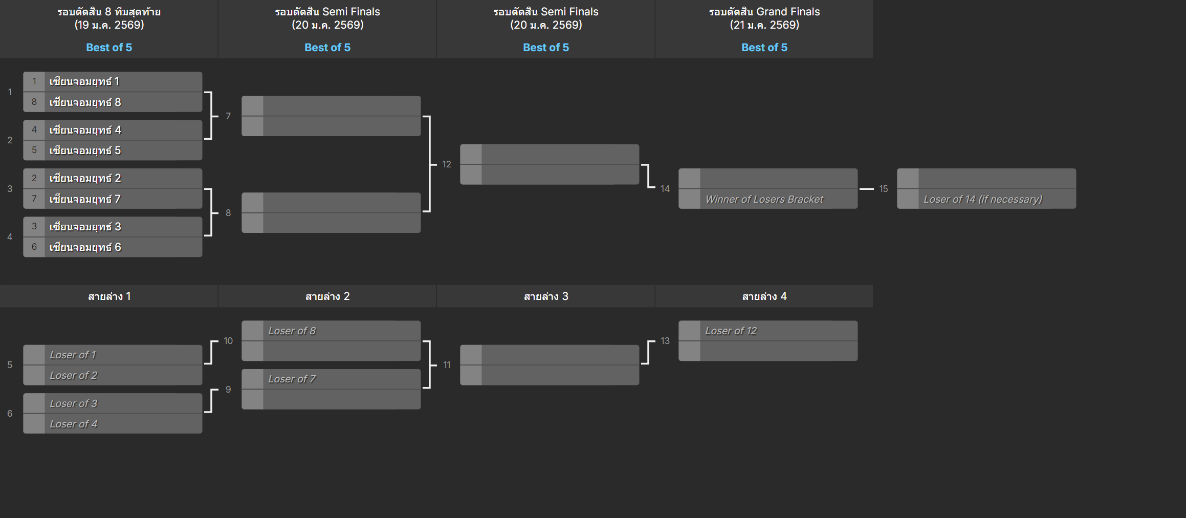 📅กำหนดการศึกชิงจ้าวยุทธจักรครั้งที่ 6 รอบตัดสิน 8 ทีมสุดท้าย (แพ้ตกรอบได้ 1 ครั้ง Double Elimination)