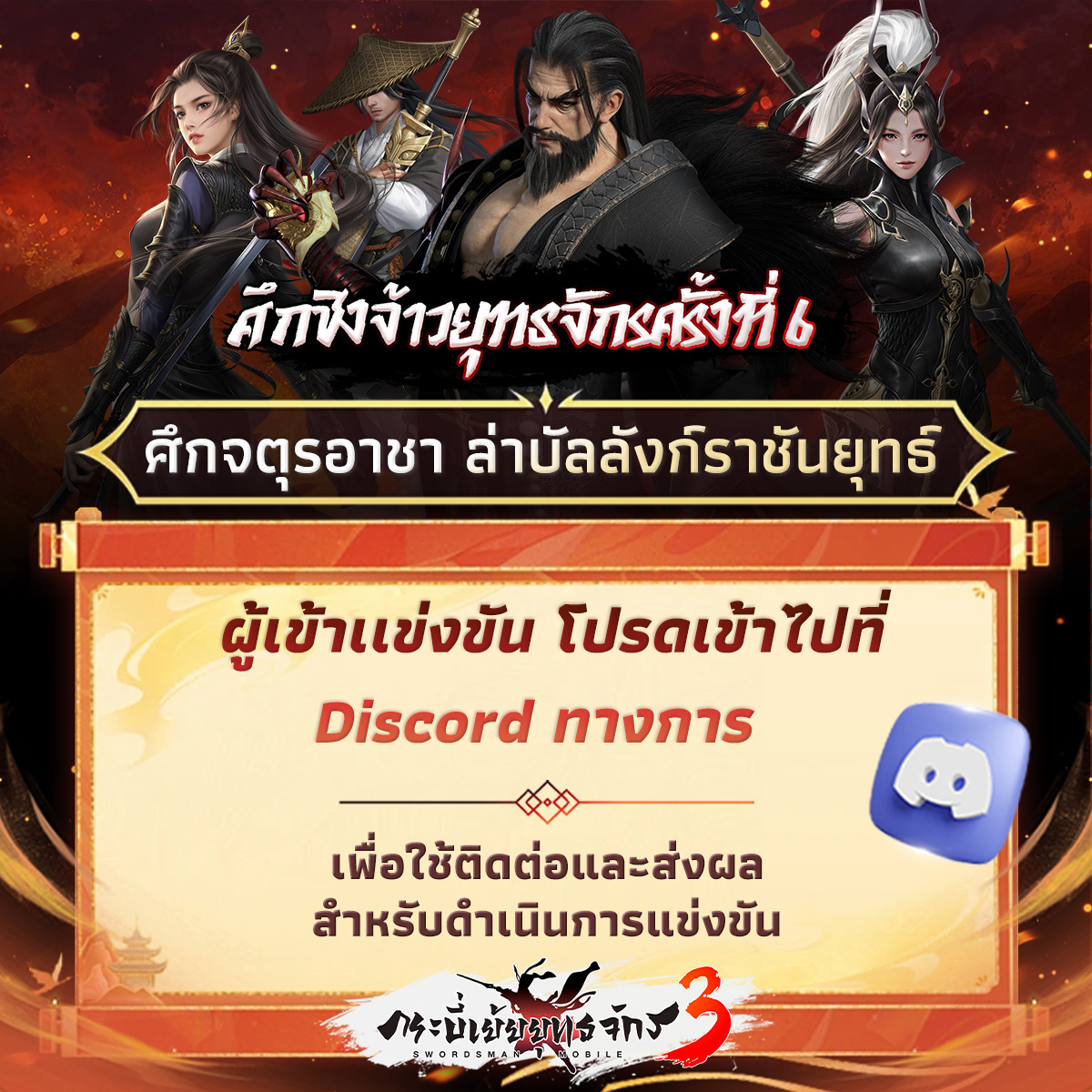 ✍️ท่านสามารถตรวจสอบกำหนดการแข่งขัน ว่าทีมไหนเจอกับทีมอะไร และรายละเอียดการแข่งขันได้ที่ Discord ทางการของเกม ในห้อง [⚔️ศึกชิงจ้าวยุทธจักรครั้งที่ 6⚔️ 4v4 ศึกจตุรอาชา ล่าบัลลังก์ราชันยุทธ์] รอบคัดเลือก