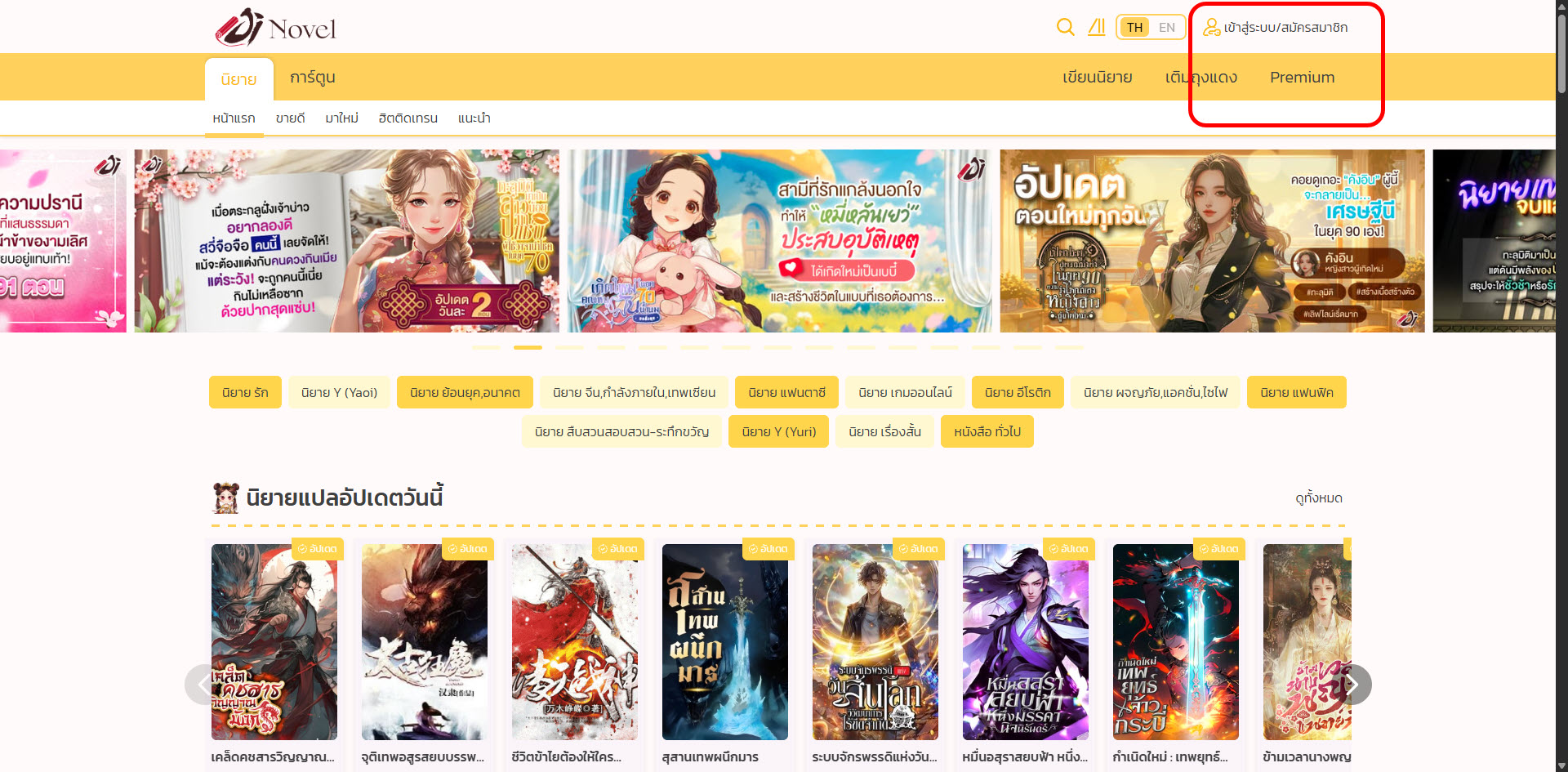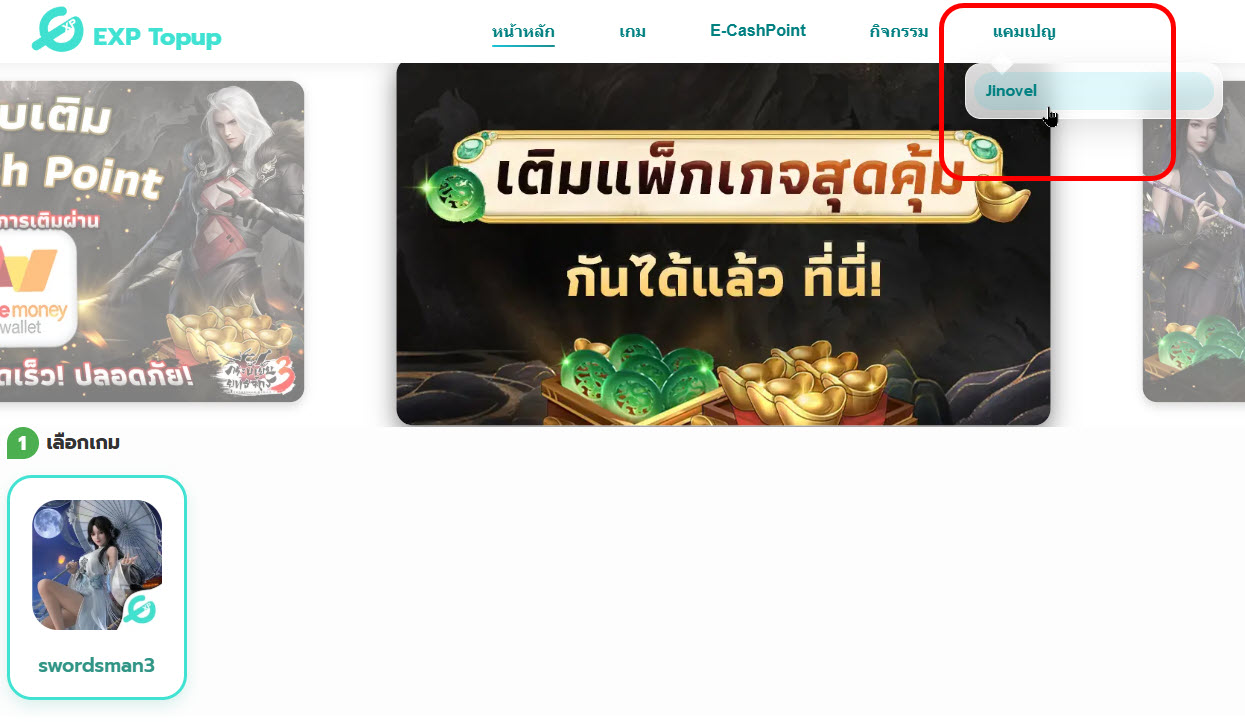 3. คลิกเข้าไปที่คำว่า “แคมเปญ” มุมขวาบน แล้วเลือก “Jinovel” หรือคลิกตรง แบนเนอร์ (รูปโฆษณา) ก็ได้เช่นกัน