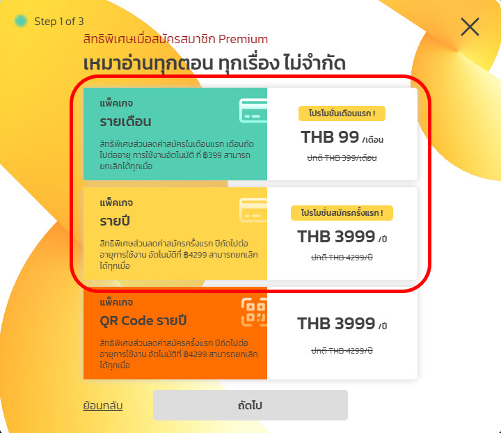 4. เลือกแพ็กเกจที่ต้องการสมัคร โดยมีให้เลือกแบบ รายเดือนและรายปี (แบบ QR Code รายปี จะไม่สามารถใส่ Code ได้) เลือกเสร็จแล้วให้คลิกปุ่ม “ถัดไป”