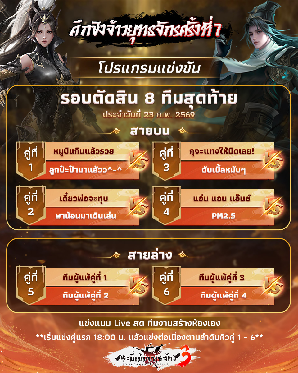 📢ศึกชิงจ้าวยุทธภพครั้งที่ 7 ได้ฤกษ์แข่งขันรอบตัดสิน 8 ทีมสุดท้าย ประจำวันที่ 23 ก.พ. 2569 ที่เราคัดทีมสุดแกร่ง มาลุยกันให้รู้แพ้ชนะ ในรูปแบบกติกาแพ้ตกรอบได้ 1 ครั้ง (Double Elimination) ใครจะตกรอบไปก่อน ติดตามเชียร์ชมดู Live สด เช็คโปรแกรมแข่งกันได้เลยที่นี่!!