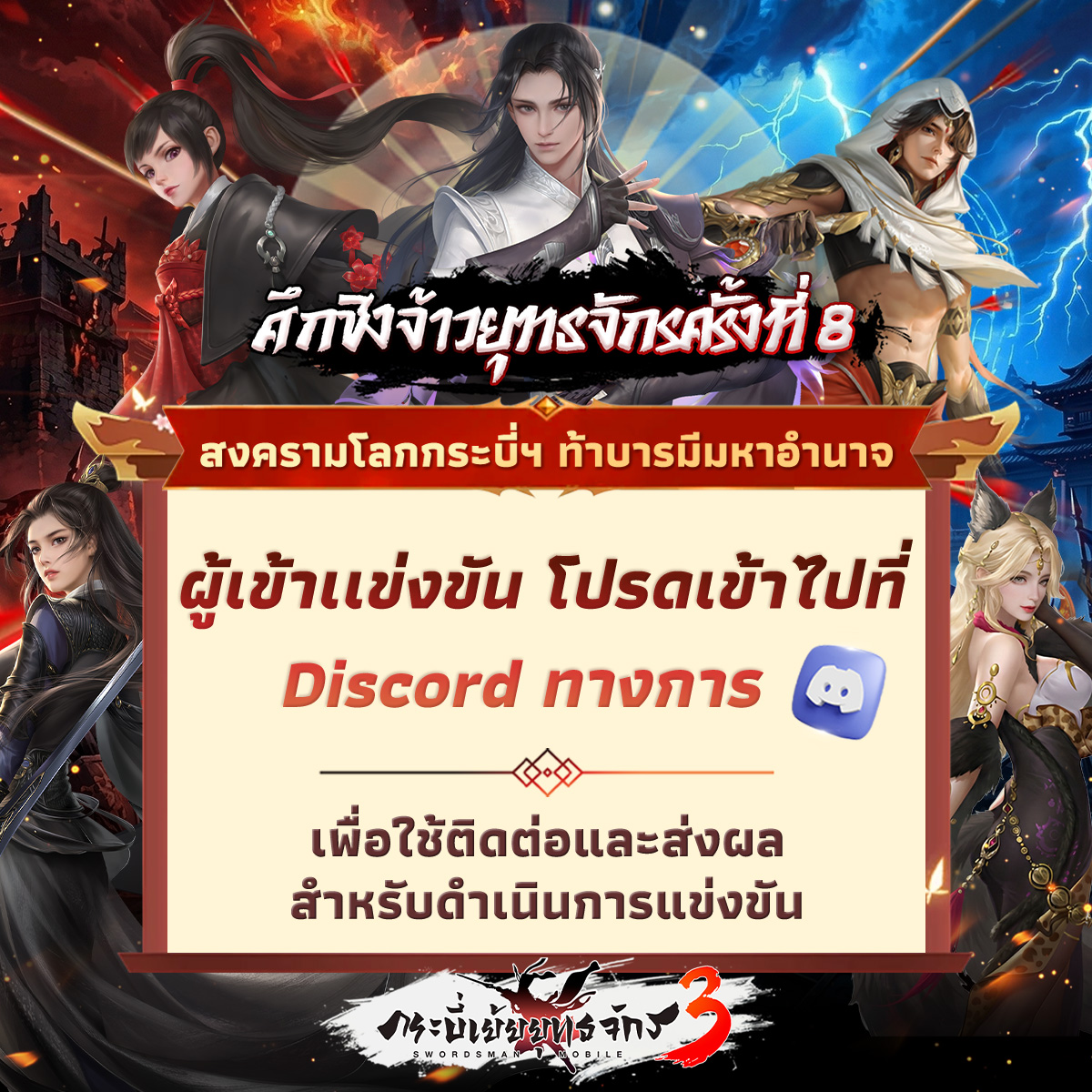 ✍️ท่านสามารถตรวจสอบกำหนดการแข่งขัน ว่าทีมไหนเจอกับทีมอะไร และรายละเอียดการแข่งขันได้ที่ Discord ทางการของเกม ในห้อง [⚔️ศึกชิงจ้าวยุทธจักรครั้งที่ 8⚔️ 5v5 สงครามโลกกระบี่ฯ ท้าบารมีมหาอำนาจ] รอบคัดเลือกและรอบตัดสิน