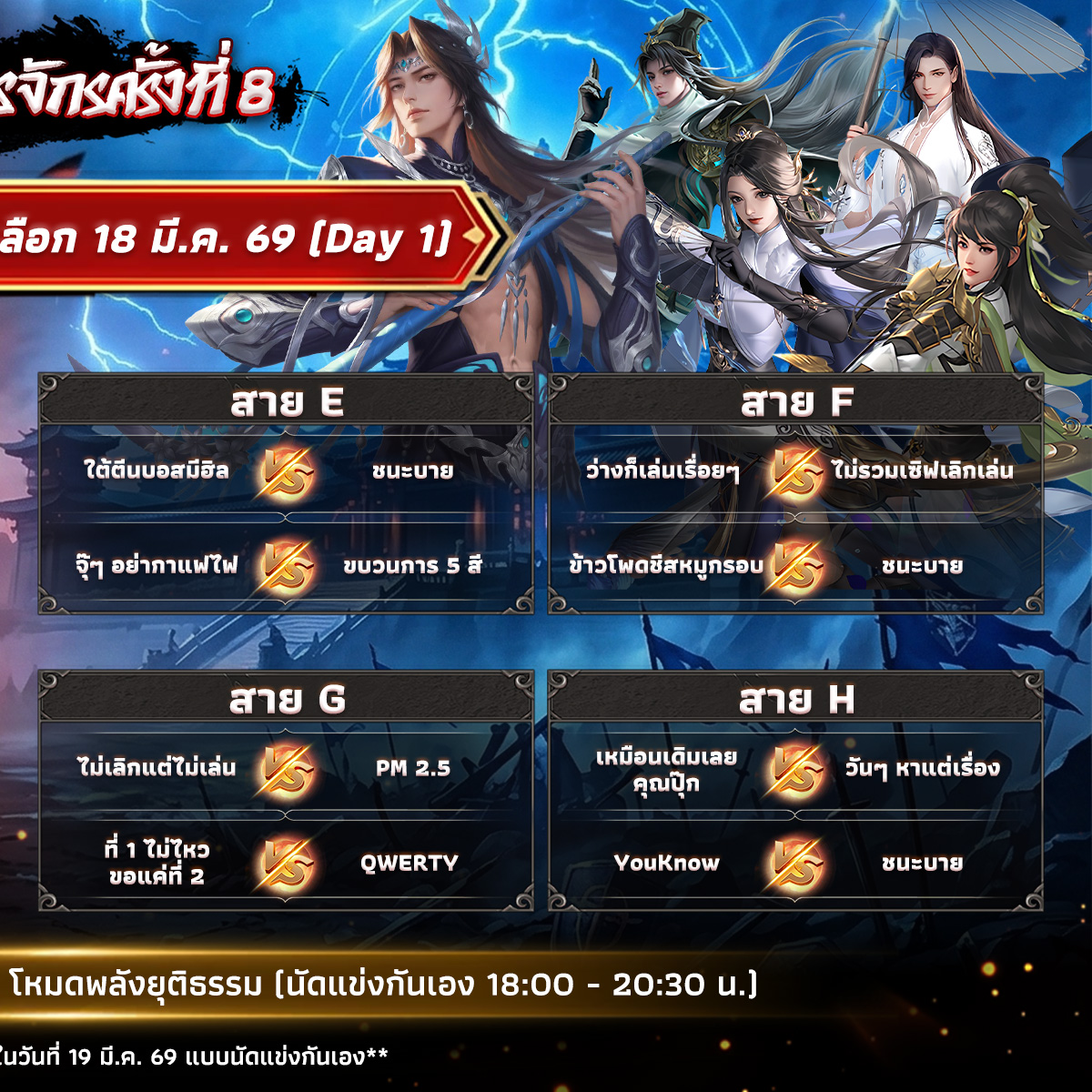 📢ศึกชิงจ้าวยุทธภพครั้งที่ 8 ในชื่อ 5v5 สงครามโลกกระบี่ฯ ท้าบารมีมหาอำนาจ (โหมดยุติธรรม) วันที่ 18 มี.ค. 69 (วันนี้) จะเริ่มต้นแข่งขันในรอบคัดเลือก Day 1 โดยแข่ง BO3 ฉาก วิมานหยกและตำหนักศักดิ์สิทธิ์ กติกาเดิม ห้ามใช้สำนักซ้ำกันภายในทีม รวมทีม 5 คน ใส่กันให้นัวรัวสกิลจนแสบตา กองเชียร์และนักแข่งติดตามตารางกันได้ที่นี่!!⬇