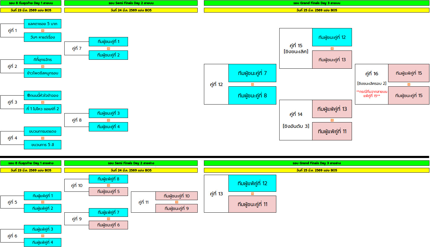 🆚โปรแกรมการแข่งขันรอบตัดสิน 8 ทีมสุดท้าย ซึ่งจะเริ่มขึ้นในวันที่ 23 มีนาคม 2569🆚 แข่งแบบ Bo5 ทีมงานจะเป็นผู้สร้างห้อง แข่งเรียงตามคิว เพื่อทำการ Live สด!! แสดงฝีมือให้ชาวโลกรับรู้ เริ่มตั้งแต่ 18:00 น. เป็นต้นไป ขอให้ทุกทีมรักษาเวลาในการแข่งขัน และเอาใจช่วยทุกคน