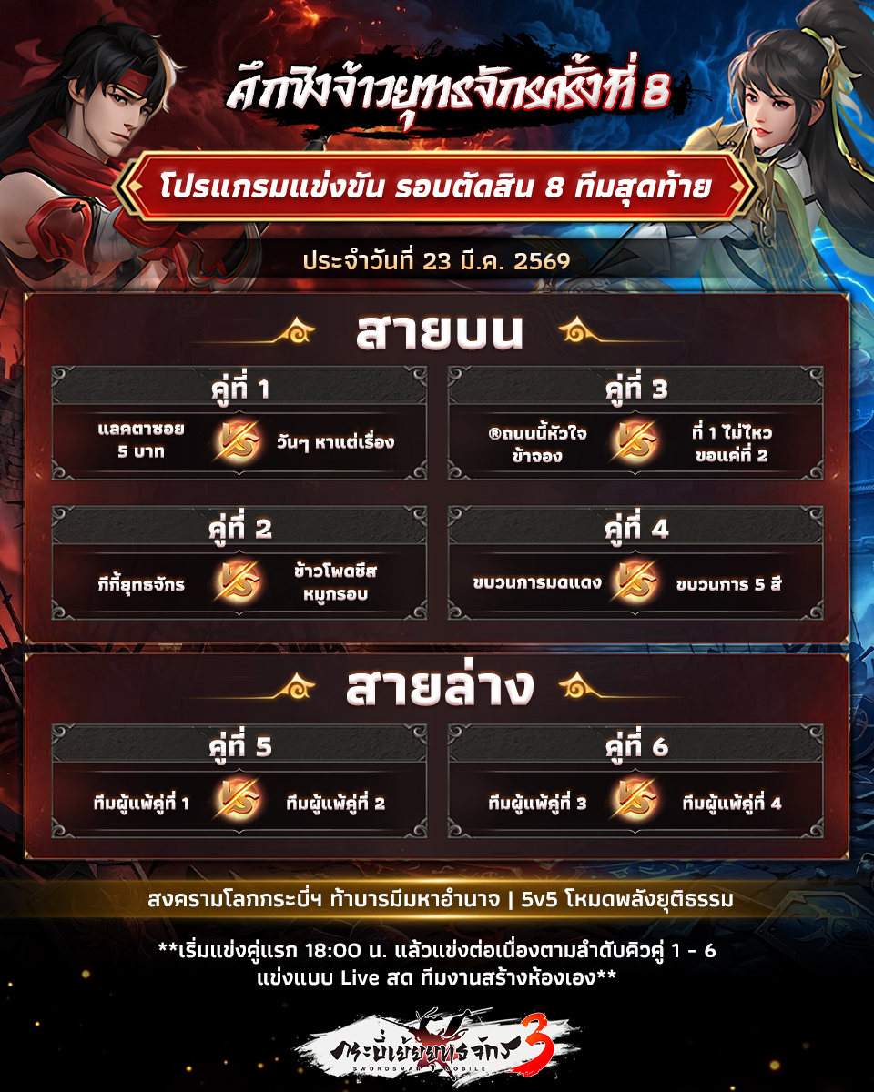 📢ศึกชิงจ้าวยุทธภพครั้งที่ 8 ได้ฤกษ์แข่งขันรอบตัดสิน 8 ทีมสุดท้าย ประจำวันที่ 23 มีนาคม 2569 ที่เราคัดทีมสุดแกร่ง มาลุยกันให้รู้แพ้ชนะ ในรูปแบบกติกาแพ้ตกรอบได้ 1 ครั้ง (Double Elimination) ใครจะตกรอบไปก่อน ติดตามเชียร์ชมดู Live สด เช็คโปรแกรมแข่งกันได้เลยที่นี่!!