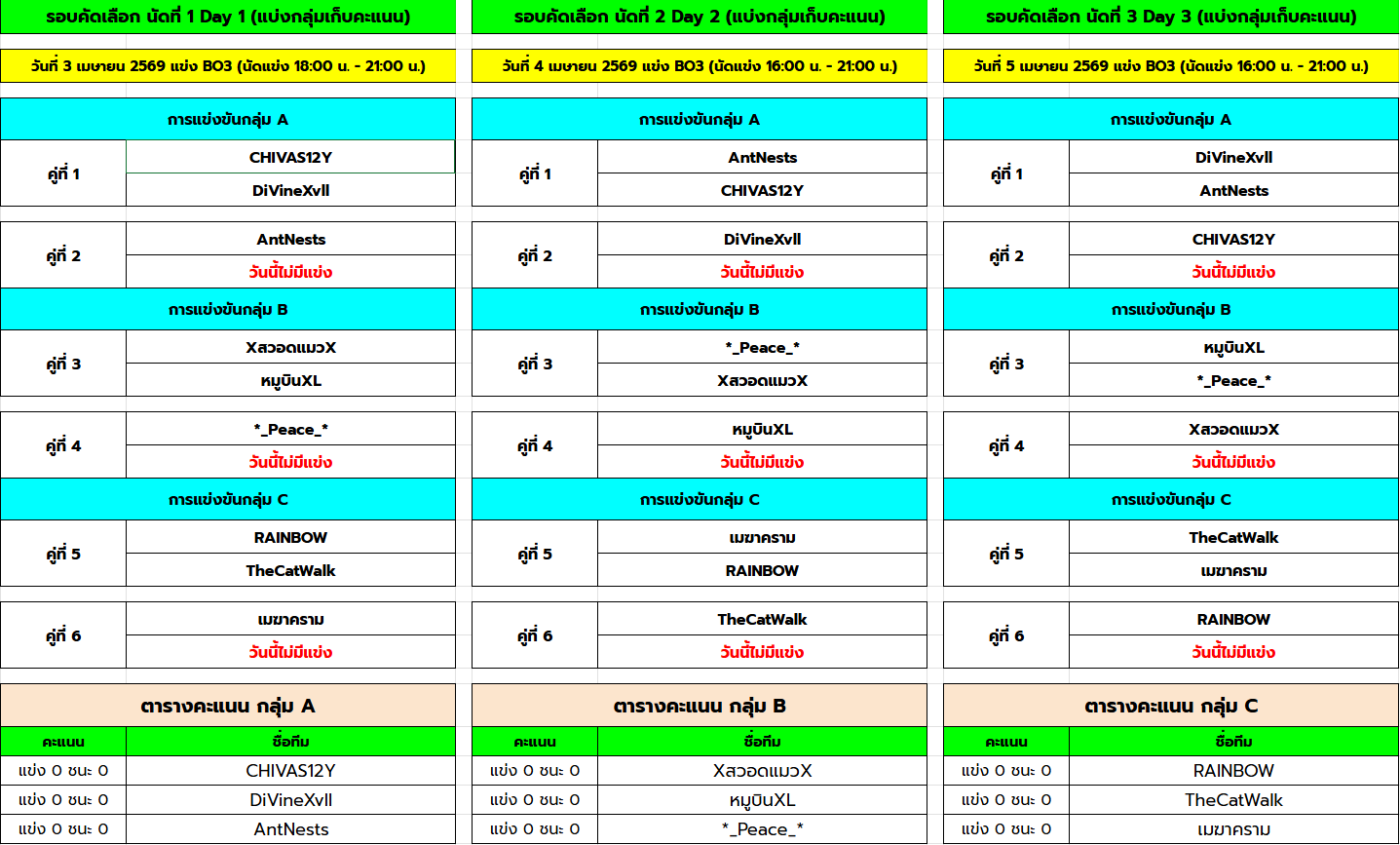📢วันแข่งขันรอบคัดเลือก Day 1: วันที่ 3 เม.ย. 69 (นัดแข่งเวลา 18:00 น. – 21:00 น.)