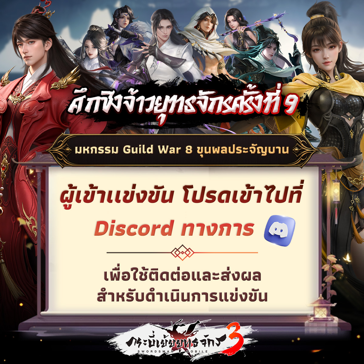 ✍️ท่านสามารถตรวจสอบกำหนดการแข่งขัน ว่าทีมไหนเจอกับทีมอะไร และรายละเอียดการแข่งขันได้ที่ Discord ทางการของเกม ในห้อง [⚔️ศึกชิงจ้าวยุทธจักรครั้งที่ 9⚔️ มหกรรม Guild War 8v8 ประจัญบาน] รอบคัดเลือกและรอบตัดสิน