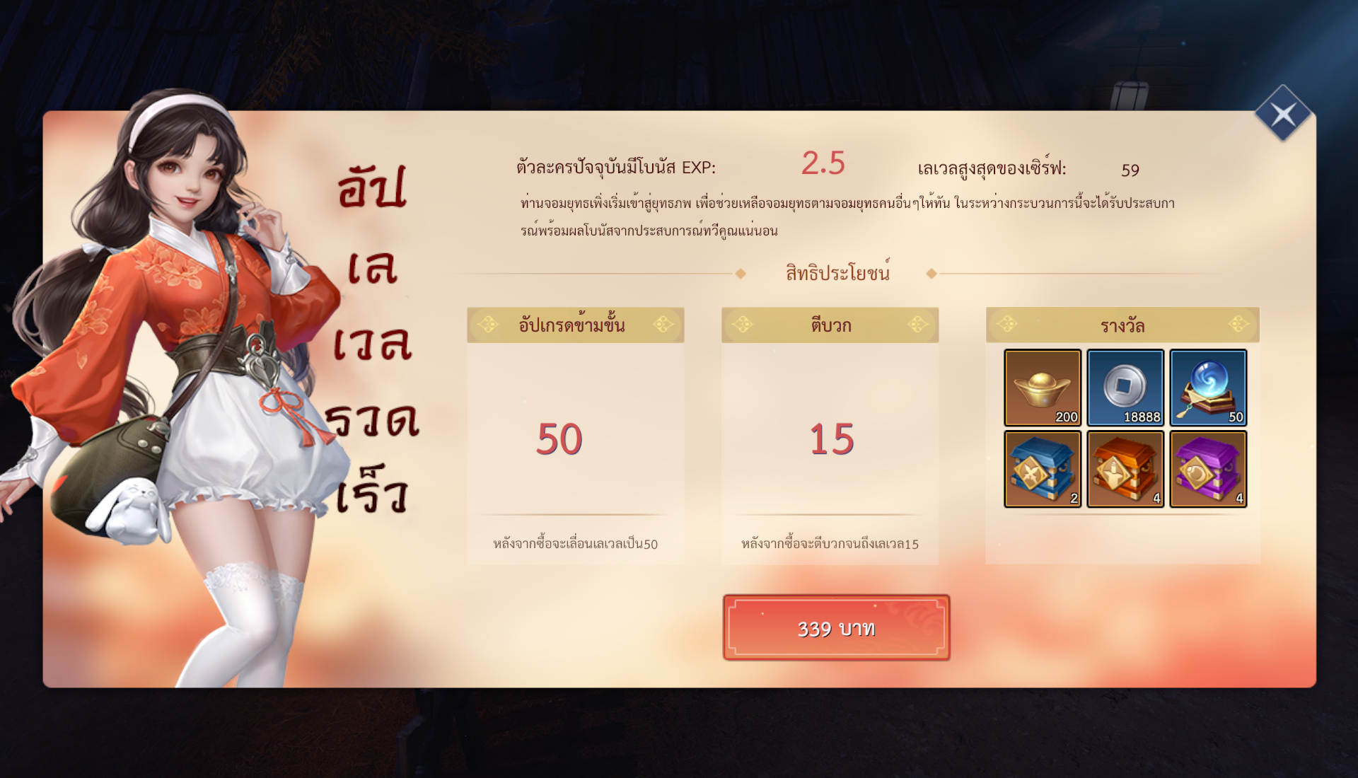 🛒สิทธิพิเศษสำหรับท่านจอมยุทธ์ เพื่อเร่งพลังเลเวลแบบชั่วพริบตา ให้ไปพิชิตยุทธภพโดยพลัน เพียงแค่กดซื้อแพ็กอัปเลเวลรวดเร็วภายในเกม (เข้าตรงอัปเกรดข้ามขั้น) ทีมงานจัดเต็มแจกของแถมสุดคุ้มทันที! โดยของรางวัลนั้นจะส่งมอบให้วันถัดไปหลังจากกดซื้อ✨