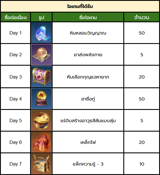 - ถ้าพลาดการเติมซื้อในบางวัน ระบบจะยังคงนับวันถัดไป ต่อจากที่เติมลำดับต่อเนื่องการเติมล่าสุด