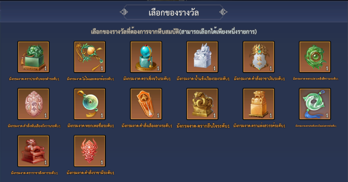 ไอเทมที่เลือกได้จากกล่อง “หีบเลือกตราทหารมังกรผงาด”