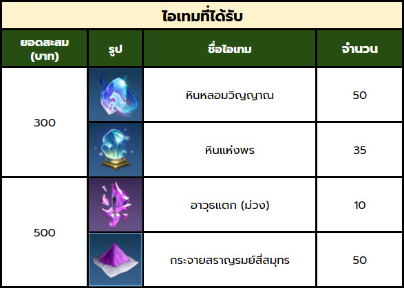 - ไม่ว่าจะใช้จ่ายซื้อแพ็กเกจเติมทองหรือหยก ไปถึงยอดสะสมระดับเท่าไร ก็จะได้ของรางวัลยอดสะสมระดับก่อนหน้าทั้งหมดด้วย ตัวอย่างเช่น หากใช้จ่ายสะสมครบ 500 บาท ก็จะได้ของรางวัลทั้งยอดสะสม ระดับ 500 บาท และระดับ 300 บาท
