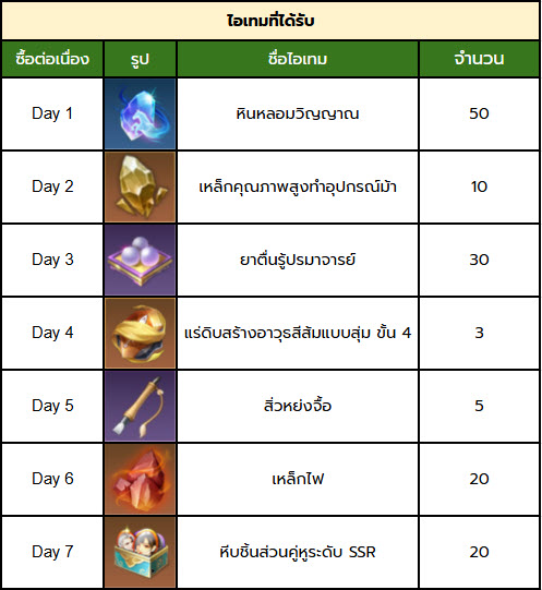 • ถ้าพลาดการเติมซื้อในบางวัน ระบบจะยังคงนับวันถัดไป ต่อจากที่เติมลำดับต่อเนื่องการเติมล่าสุด