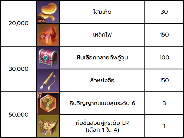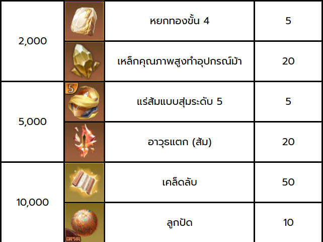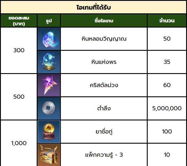 - ไม่ว่าจะใช้จ่ายซื้อแพ็กเกจเติมทองหรือหยก ไปถึงยอดสะสมระดับเท่าไร ก็จะได้ของรางวัลยอดสะสมระดับก่อนหน้าทั้งหมดด้วย ตัวอย่างเช่น หากใช้จ่ายสะสมครบ 500 บาท ก็จะได้ของรางวัลทั้งยอดสะสม ระดับ 500 บาท และระดับ 300 บาท