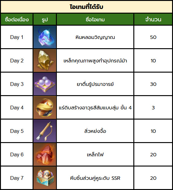 - ถ้าพลาดการเติมซื้อในบางวัน ระบบจะยังคงนับวันถัดไป ต่อจากที่เติมลำดับต่อเนื่องการเติมล่าสุด