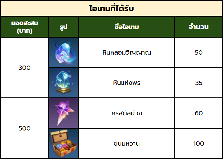 ก็จะได้ของรางวัลทั้งยอดสะสม ระดับ 500 บาท และระดับ 300 บาท - การส่งไอเทม จะส่งให้ทางกล่องจดหมายในเกม โดยมีรอบการส่งดังนี้