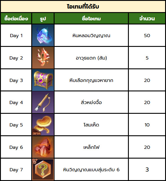 - ถ้าพลาดการเติมซื้อในบางวัน ระบบจะยังคงนับวันถัดไป ต่อจากที่เติมลำดับต่อเนื่องการเติมล่าสุด
