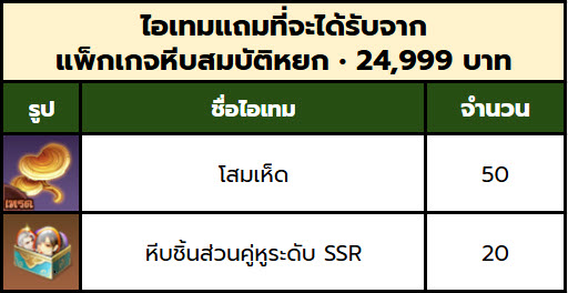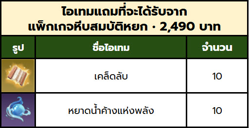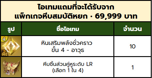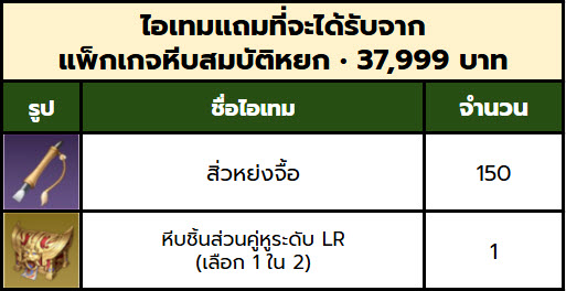 ตัวอย่างเช่น ซื้อแพ็กหยกราคา 499 ทั้งหมด 3 ครั้ง จะได้รับไอเทมแถมฟรี รวมกัน 3 ชุด ดังนี้