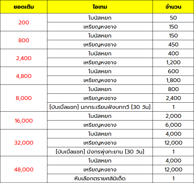 ⏱ระยะเวลา: 5 ธันวาคม – 14 ธันวาคม 2568⏱ ซีซั่นใหม่ของโบนัสเติมเงินกลับมาแล้ว! ยิ่งเติมมาก ยิ่งได้มาก รอบนี้ได้เป็นหยก และตามด้วยบับเบิ้ลแชทสุดพิเศษ🎁