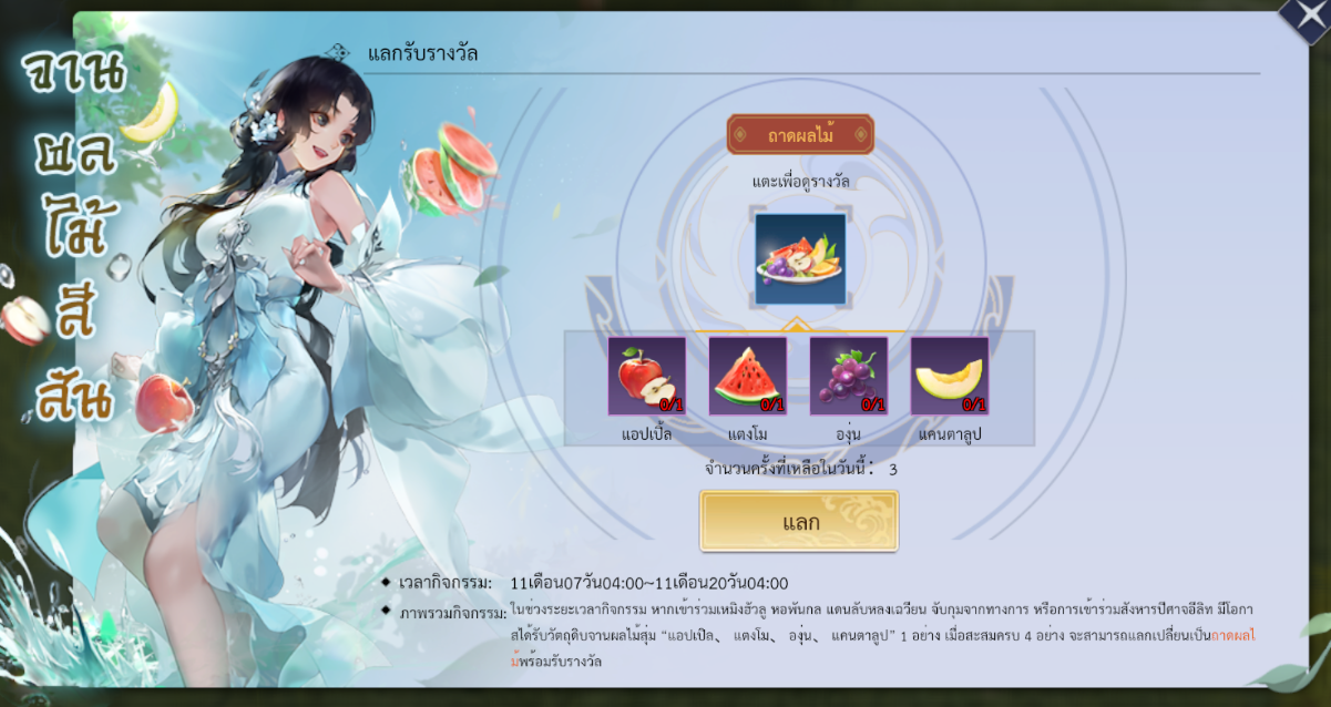 เข้าร่วมกิจกรรมในโหมด เหมิงฮัวลู / หอพันกล / แดนลับหลงเฉวียน / การจับกุมจากทางการ / สังหารปีศาจอีลิท เพื่อรับ “ผลไม้สุ่ม” ได้แก่ แอปเปิล, แตงโม, องุ่น และเมลอน🍉 เมื่อสะสมครบ 4 ชนิด ก็สามารถแลกรับ ถาดผลไม้ พร้อมของรางวัลดังนี้