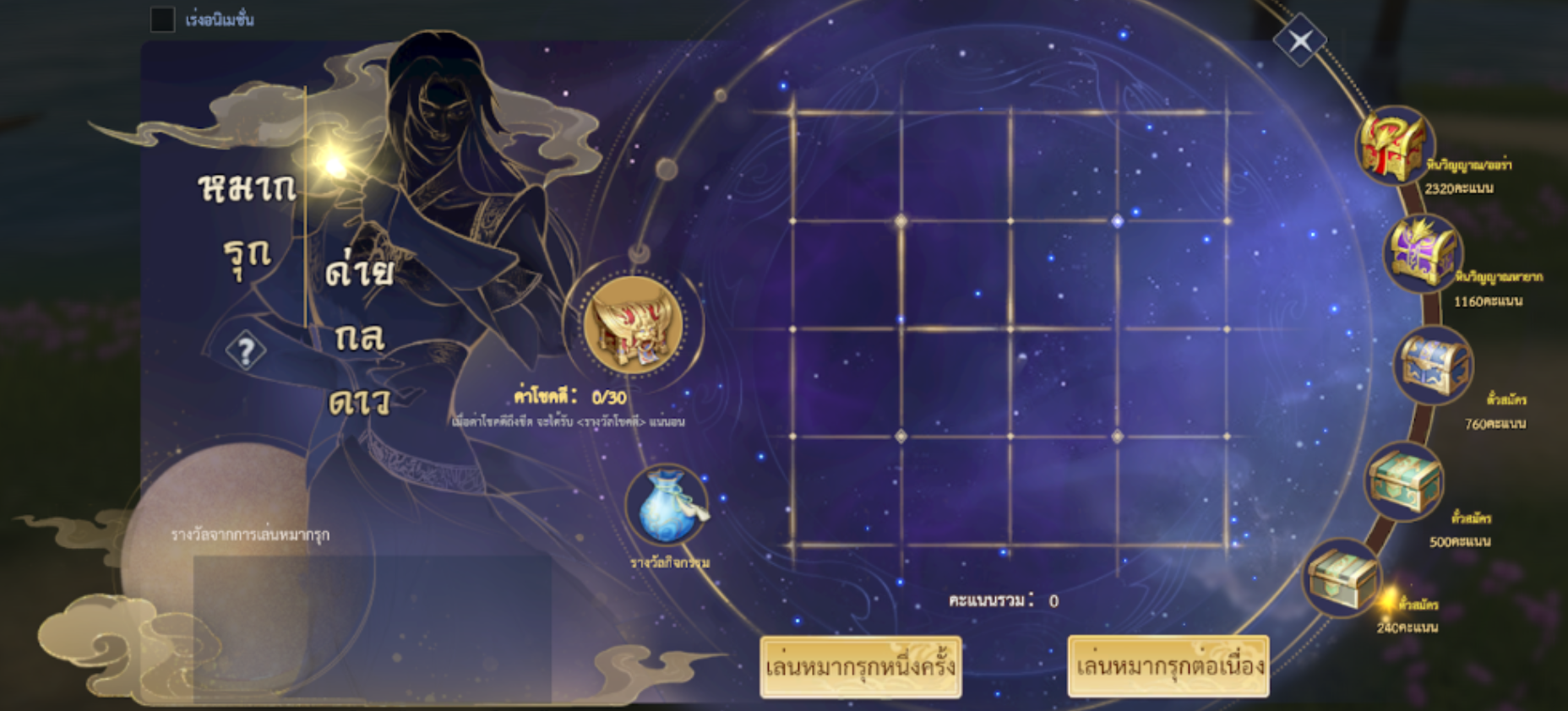 วางหมาก 1 ตัว รับรางวัล 1 ครั้ง หากทำ “ห้าหมากเรียง” มีโอกาสรับไอเทมหายาก และสะสมคะแนนค่าโชคดีเมื่อค่าโชคดีครบ 30 แต้ม