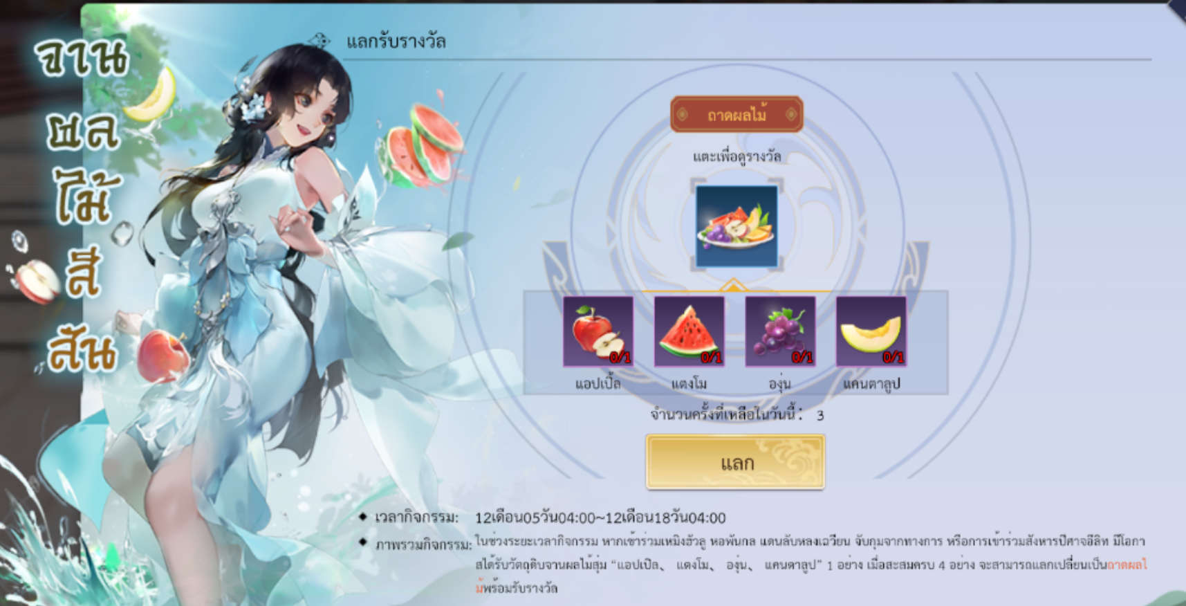 เข้าร่วมกิจกรรมในโหมด เหมิงฮัวลู / หอพันกล / แดนลับหลงเฉวียน / การจับกุมจากทางการ / สังหารปีศาจอีลิท เพื่อรับ “ผลไม้สุ่ม” ได้แก่ แอปเปิล, แตงโม, องุ่น และเมลอน🍉 เมื่อสะสมครบ 4 ชนิด ก็สามารถแลกรับ ถาดผลไม้ พร้อมของรางวัลดังนี้