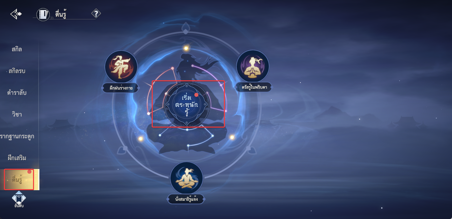 ☝ขั้นตอนเริ่มต้นในการใช้งานระบบ “ตื่นรู้” ผู้เล่นจะต้อง เข้าสู่หน้าสกิล >> เลือกเมนู “ตื่นรู้” >> กดปุ่ม เริ่มตระหนักรู้ (ดูตามภาพประกอบ)