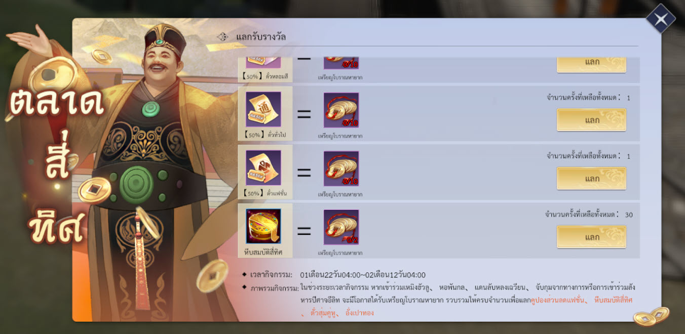 ในช่วงเวลากิจกรรม เข้าร่วม เหมิงฮัวลู, หอพันกล, แดนลับหลงเฉวียน, ภารกิจจับกุมจากทางการ หรือสังหารปีศาจอีลิท จะมีโอกาสได้รับ เหรียญโบราณหายาก นำไปแลก คูปองส่วนลดแฟชัน, หีบสีไห่, คูปองรับลงทะเบียนคู่หู และ อั่งเปาทอง