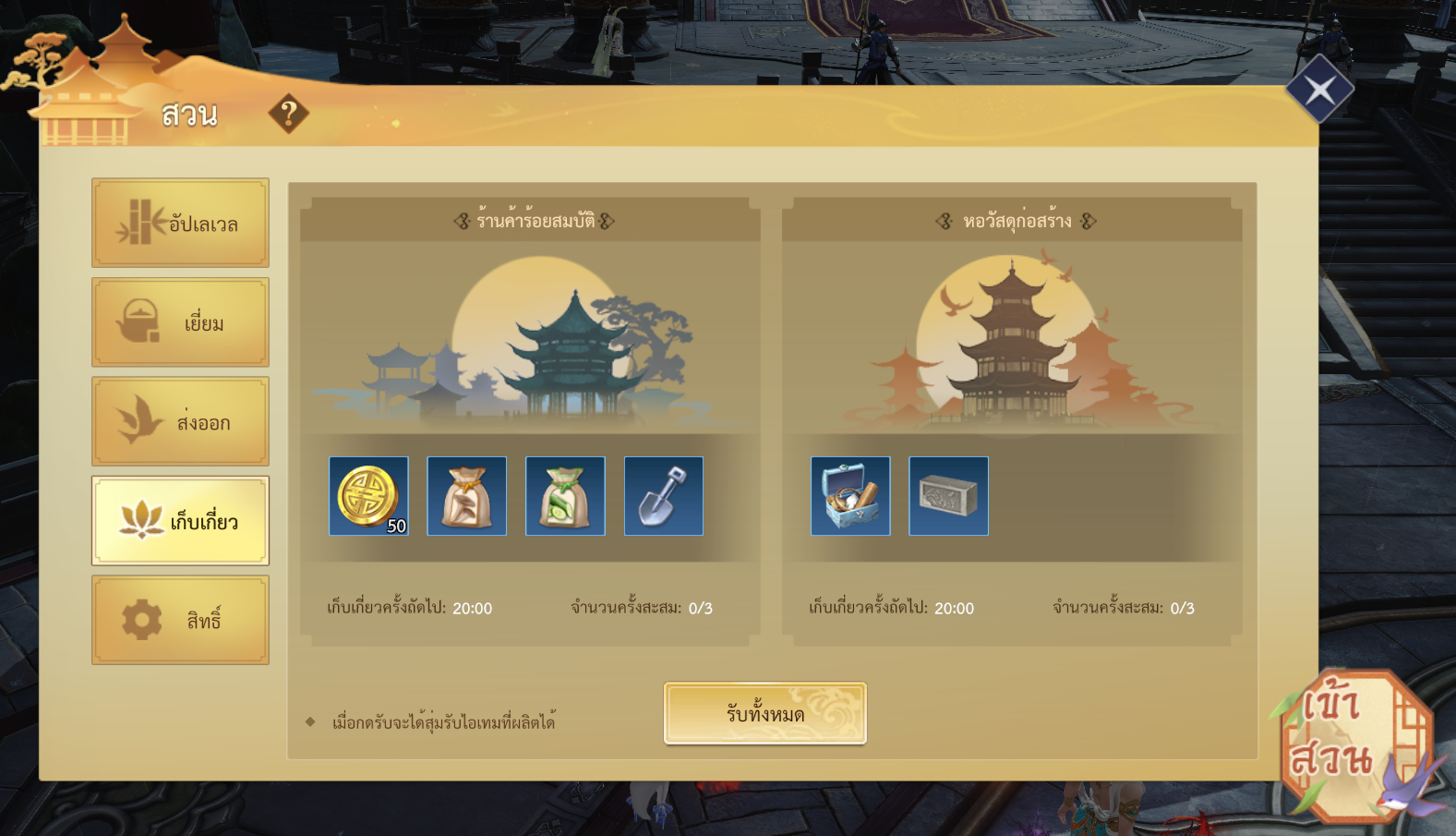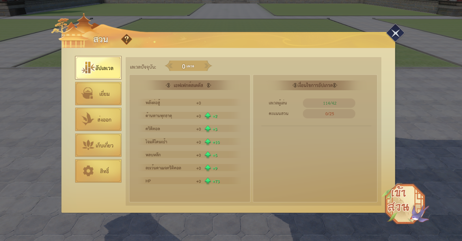 เงื่อนไขการเปิดใช้งาน : เมื่อเลเวลของท่านจอมยุทธ์ถึง เลเวล 42 จะเปิดใช้งานระบบจัดสวน