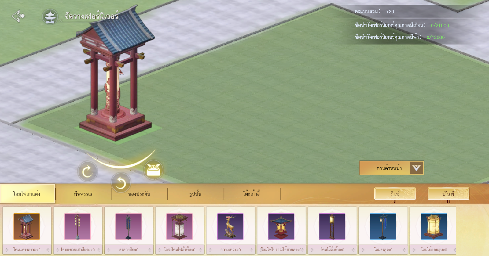 • ในพื้นที่จัดวางคุณสามารถจัดวางเฟอร์นิเจอร์ได้อย่างอิสระ เมื่อจัดวางแล้วจะช่วยเพิ่มคะแนนสวนได้