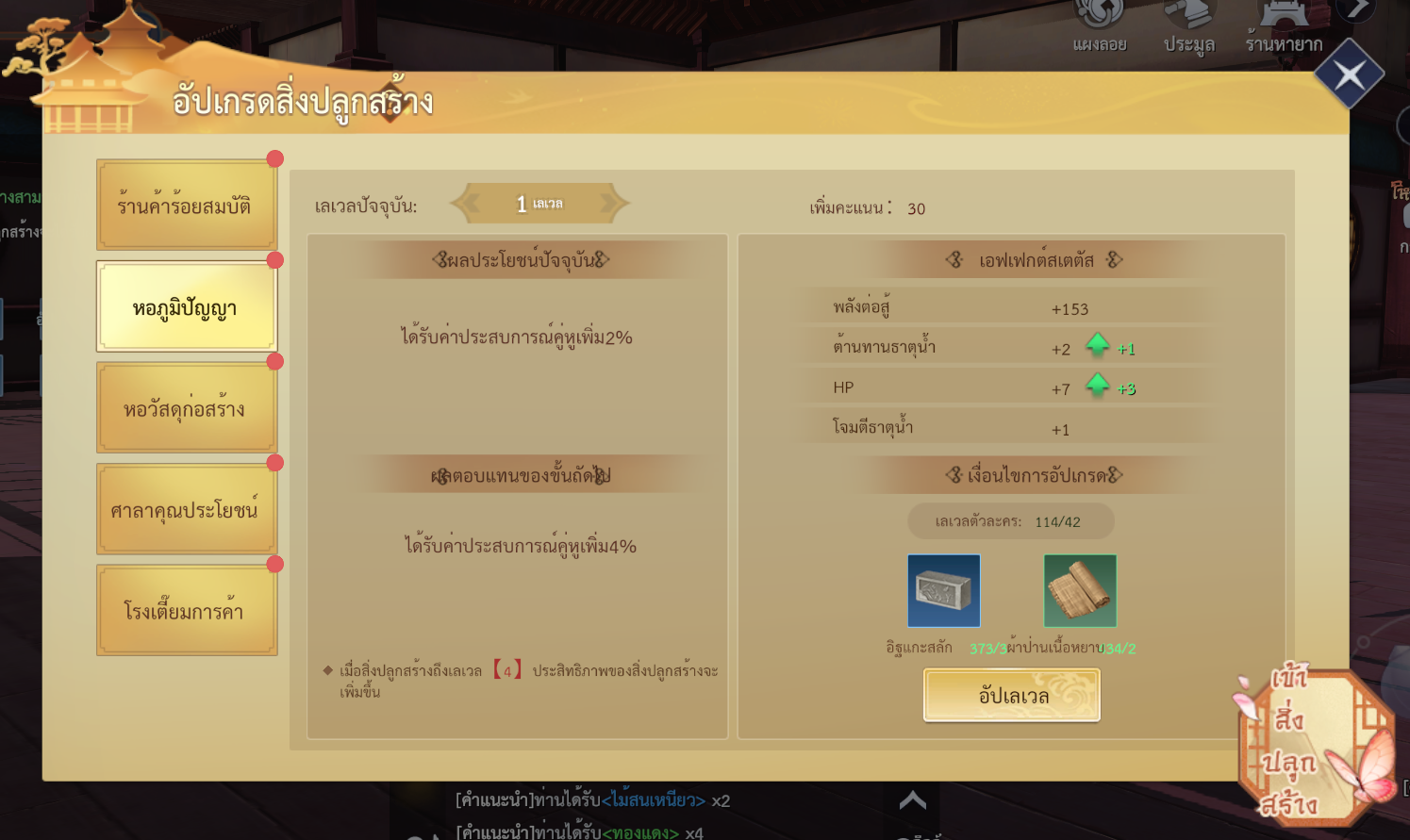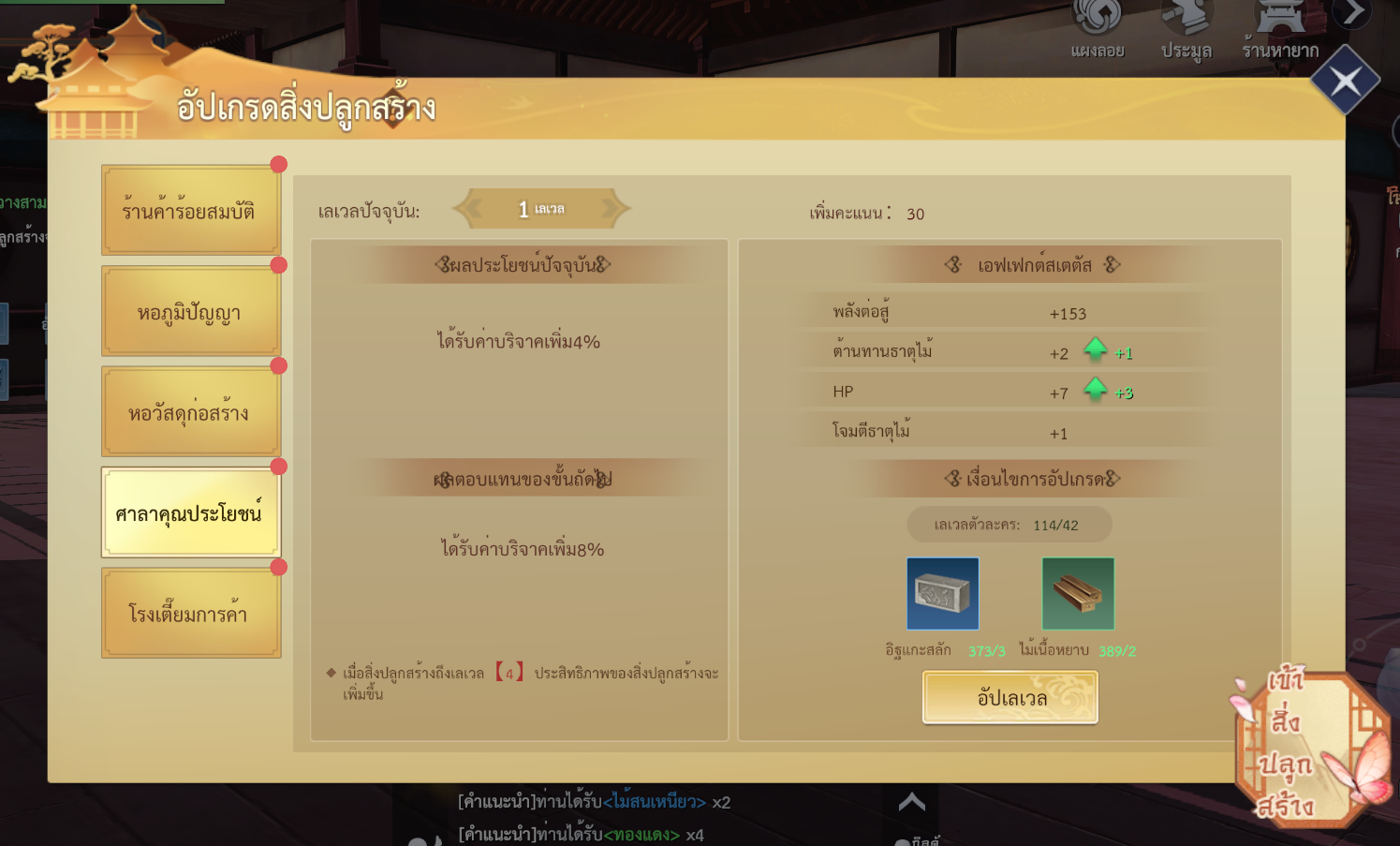 • บัฟพิเศษ: เพิ่มค่าสถานะธาตุไม้ เมื่อบริจาคกิลด์จะได้รับ ค่าบริจาคเพิ่มเติม