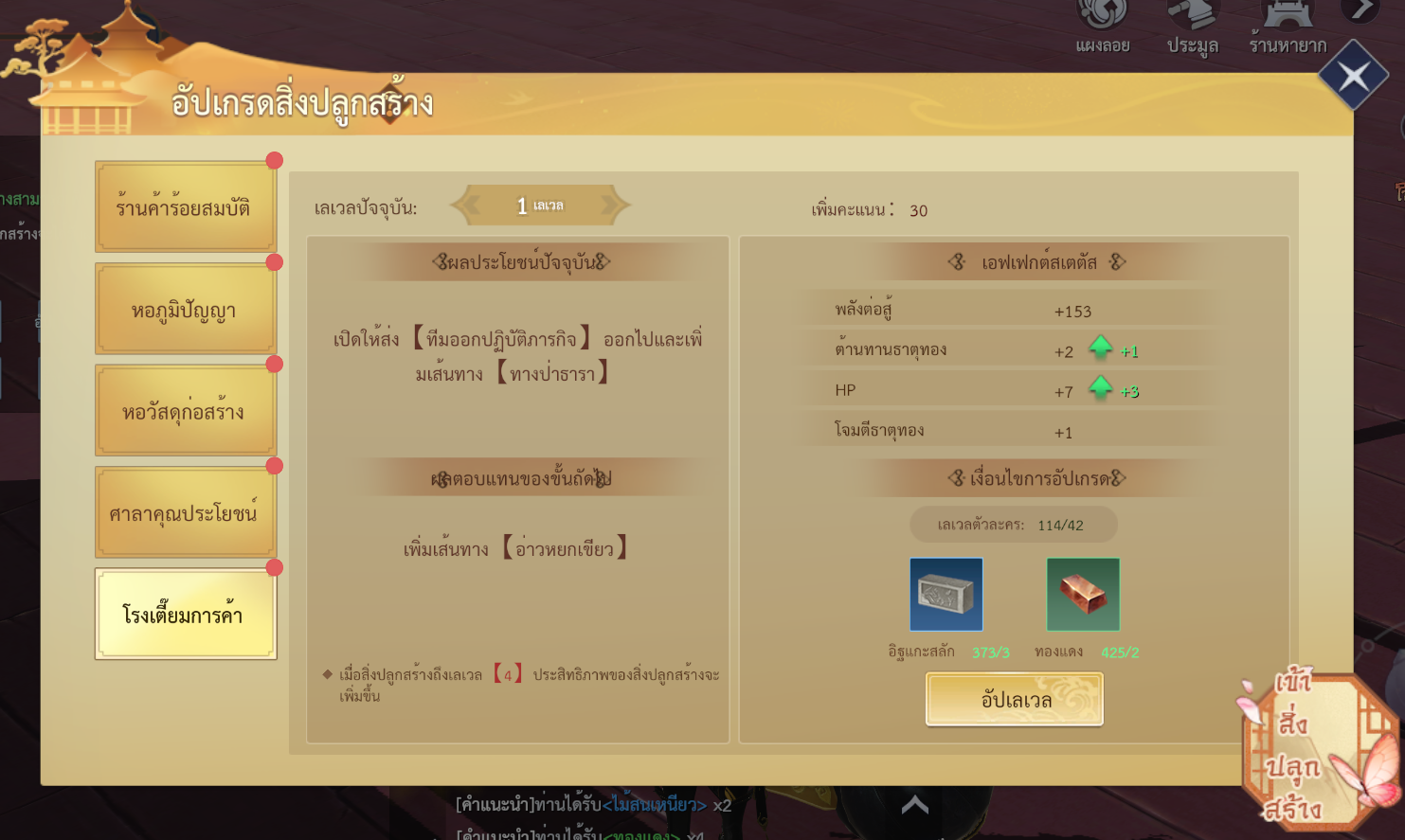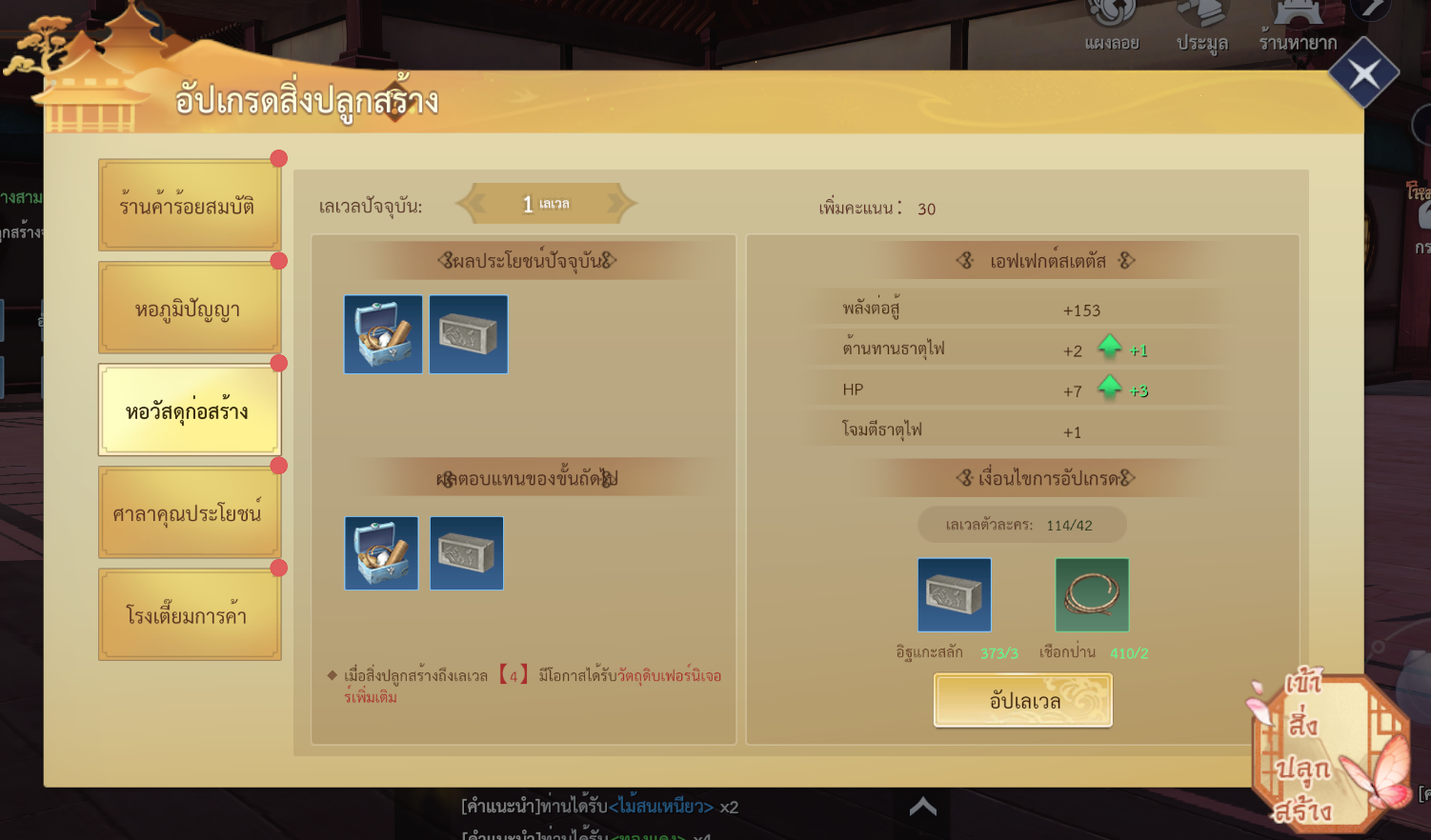 • อัปเกรดอาคารจะช่วยเพิ่มค่าสถานะ และเอฟเฟกต์บัฟของอาคาร คะแนนที่มากขึ้น รูปลักษณ์สิ่งปลูกสร้างภายนอกจะอัปเกรดตามไปด้วย